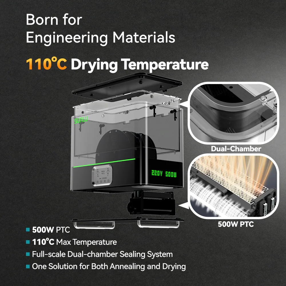 [Fast and Efficient Drying] 500W PTC ultra-high heating power makes your creation a step faster. It takes only 20 minutes to heat up to 50℃ at room temperature and 30 minutes to heat up to 70℃! Temperature can reach up to 110℃ (high temperature drying needs to take into account the temperature resistance of the filament spool)